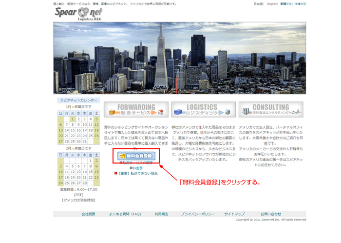 転送サービス会社であるスピアネットのサイトを開き、「無料会員登録」ボタンをクリックする。