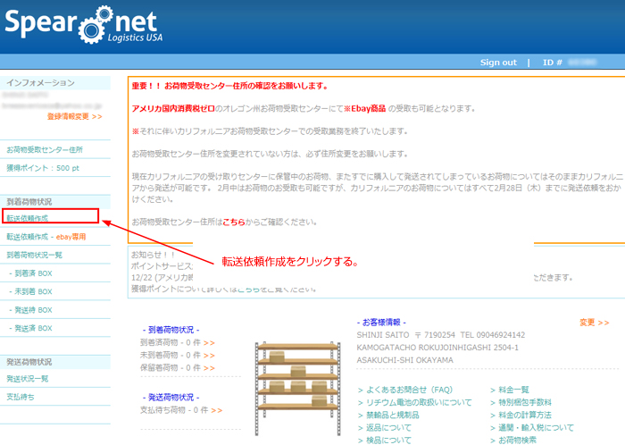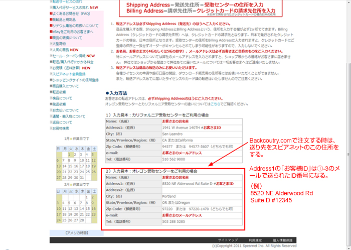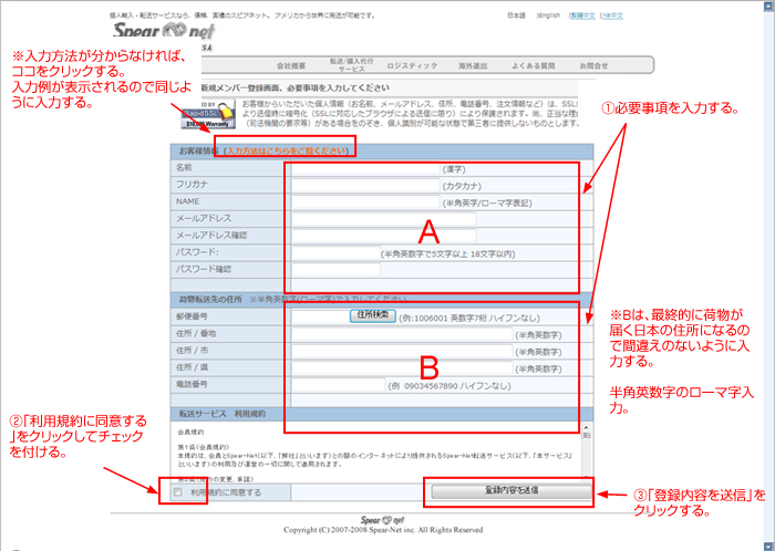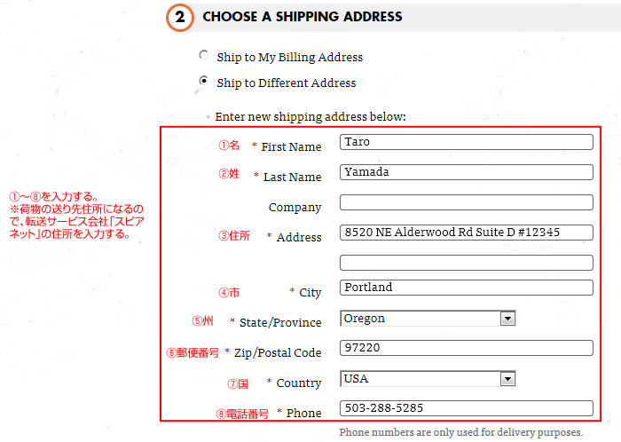 発送先住所を入力する。この部分は転送サービス会社「スピアネット」の住所になるので、@-4で確認した住所になる。