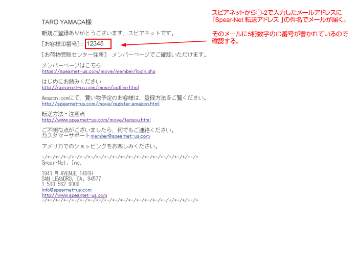下部赤字の5桁数字はスピアネットのID番号になる。ID番号は@-3で届いたメールに記載されている。