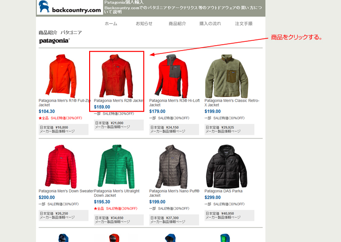 商品紹介ページで注文する商品をクリックする。