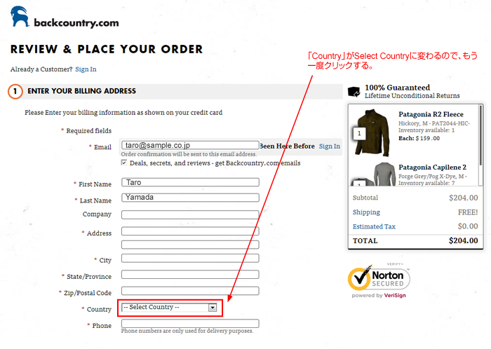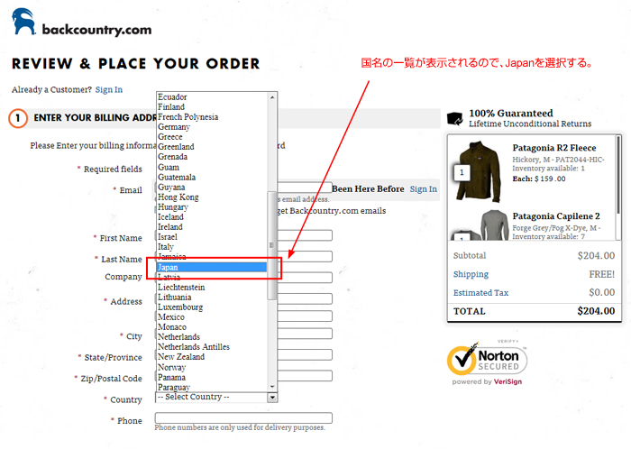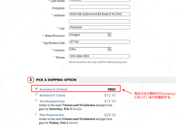 Backcountry.comで注文する時は、荷物の送り先をページ下部の住所(オレゴン州)にする。