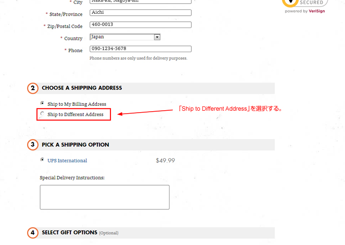 「Ship to Different Address」を選択する。