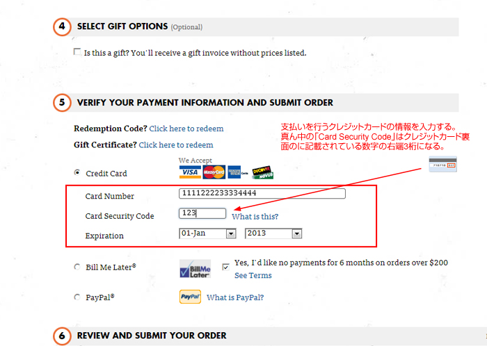 「Card Security Code」はクレジットカード裏面に記載されている数字の右端3桁になる。