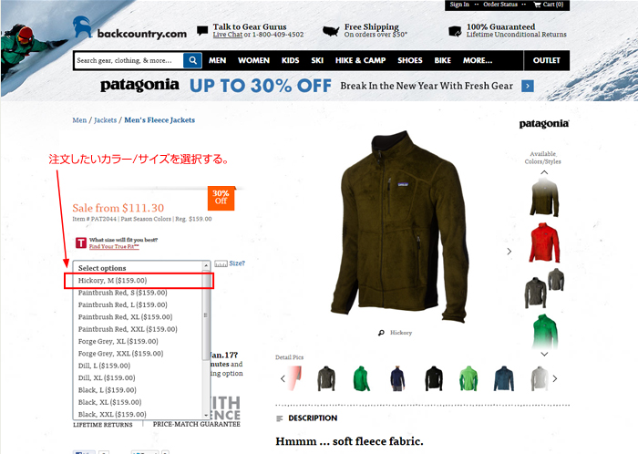 分かり難ければページ右上の「×」ボタンで一旦Backcountry.comのウィンドウを消して、A-1の商品紹介ページから同じように商品を選択する。