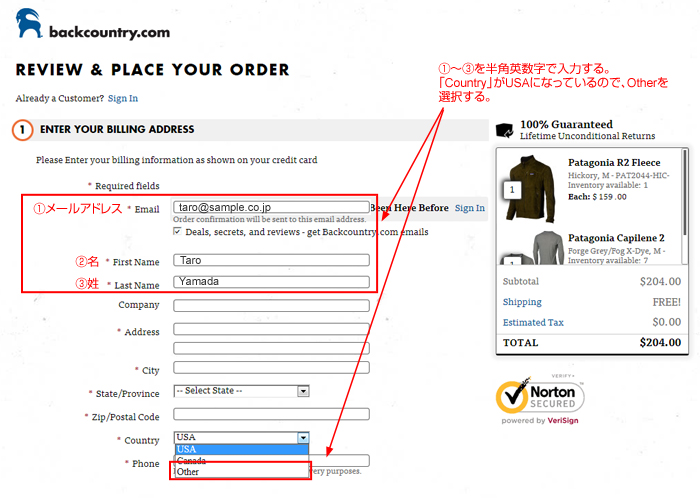 購入先は「Backcountry.com」と入力する。