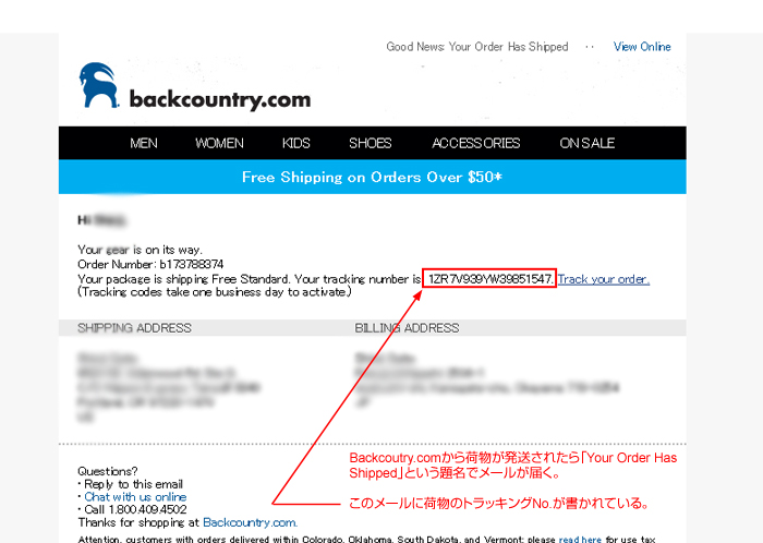 しばらくするとBackcountry.comからスピアネットに荷物が発送されて、「Your Order Has Shipped」という題名のメールが届く。