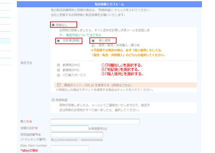 「同梱なし」、「宅配便」、「個人使用」を選択する。