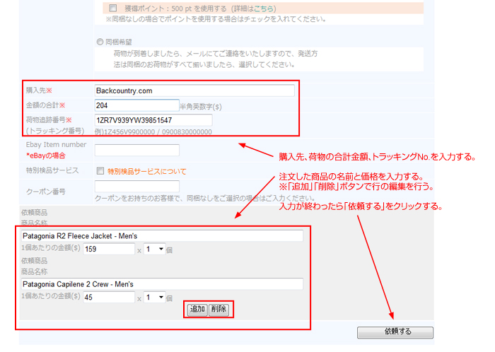 購入先、金額の合計、トラッキング番号を入力する。